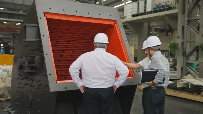 考察团先来到中誉鼎力承建的卫辉市资源有限公司时产3000吨砂石骨料生产线参观,了解该项目在规模化、环保化、智能化的高砂石骨料生产方面的经验。亚太总监 Glen先生多次表示impressive(惊叹),据他介绍,在澳大利亚当地,时产300-500吨算是规模大的,也没有封闭生产的概念。