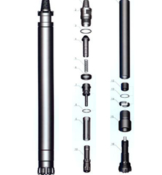 活塞、内缸、配气座、逆止阀和钻头附件等安装在细长的外缸内,外缸上端装带扳手口和联接螺纹的上接头,下端装有螺纹连接的卡钎套。