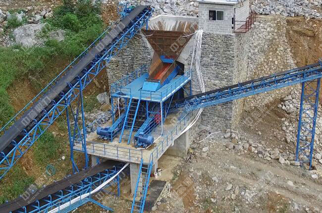 该时产300吨碎石生产线采用PCZ1512重型锤式反击破碎机,一破成型,没有设置二破;筛分出来的大块物料被返料带返回该设备进行再次破碎;