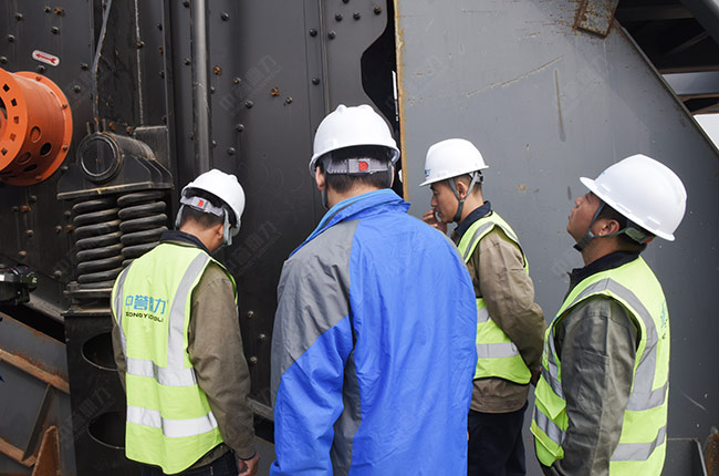 在项目建设现场,售后服务团队深入破碎机顶部认真检查每一个配件,并就项目的安装、设计工艺等进行详细说明和安装指导。
